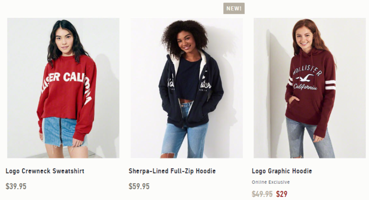 You can use product badges to highlight your newest products and appeal to shoppers that want to be ahead of the curve. Hollister marks new arrivals with a simple gray and white NEW! product badge. You might want to use colors that pop out a little more, like red or yellow, which really catch shoppers’ attention.