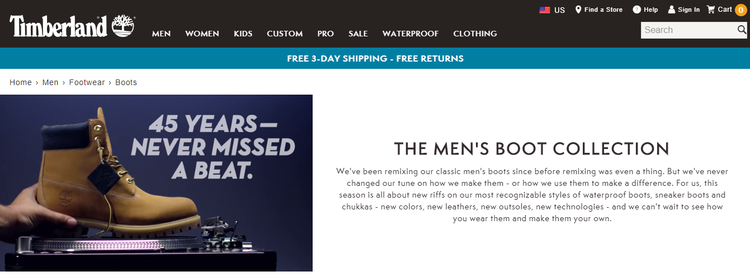 Timberland entices customers to purchase items by offering Free 3-Day Shipping (and Free Returns too). A Free Shipping badge or label could be used to highlight eligible products.
