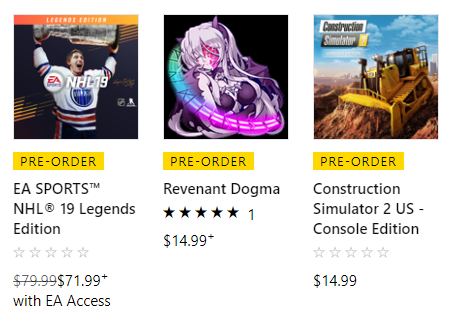 Frequently, products that will be released soon are marked with a Pre-order badge. Microsoft lists upcoming games with this badge to encourage people to buy now, before the games are even available.