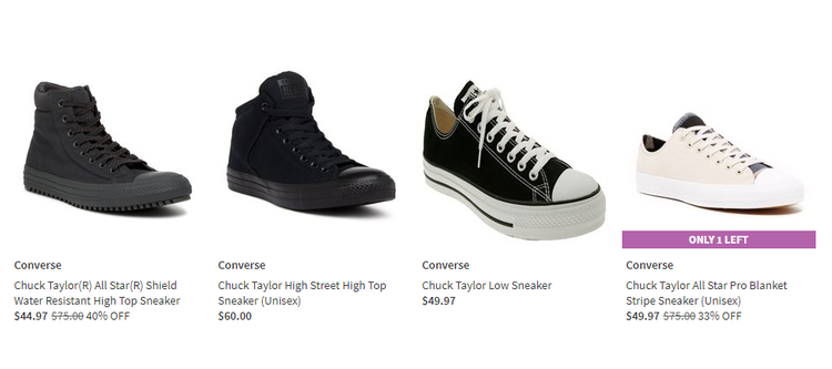 This scarcity alert that lets shoppers know an item’s stock is getting low or that the item is almost gone. For these Converse shoes (below) Nordstrom Rack displays a badge saying Only 1 Left. If a shopper wants to purchase the shoes, they must do so before they are gone.