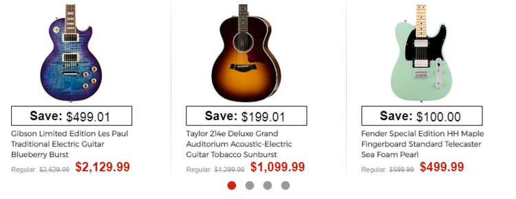Guitar Center’s recent Labor Day Deals sale showcased sale items with the dollar savings. This SAVE product sticker clearly shows how much money a customer will save if they purchase this item during the sale.