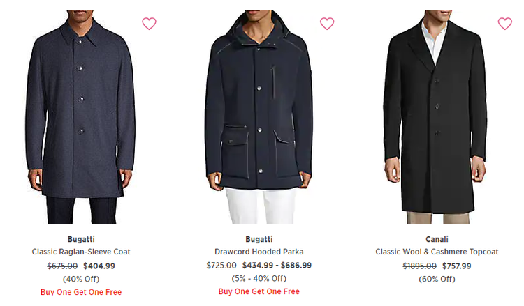In reality, this is a ½ price promotion. But it entices customers to make additional purchases to receive something free. Saks Fifth Avenue Off Fifth is an outlet site offering many BOGO items, like these coats.
