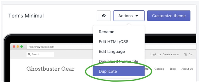 Shopify makes it easy to create a copy of your current theme. Simply click Duplicate from the Actions dropdown of your current them, as shown here: