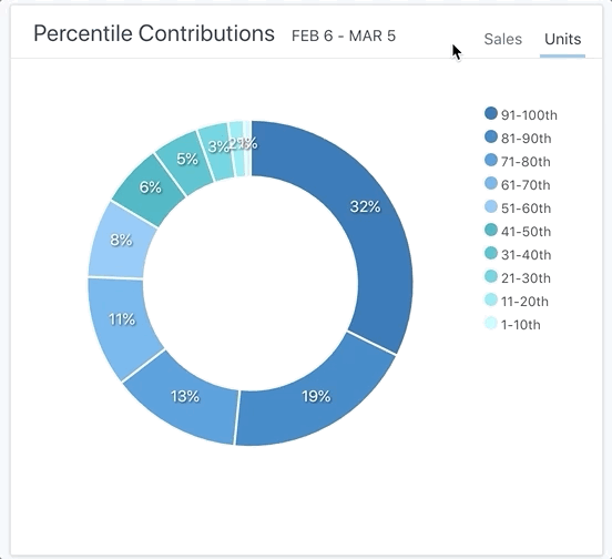 The Percentile Contributions report makes it easy to compare the contribution each percentile group makes in both gross sales and units sold relative to the overall totals for your shop.
