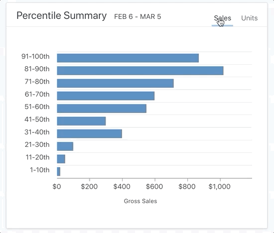 The Percentile Summary report makes it easy to see how each group of your products, broken down to the nearest 10th percentile, performs in terms of gross sales and units sold.