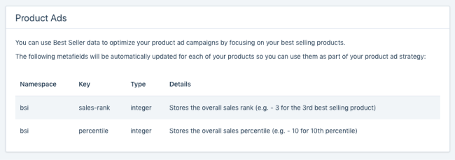 The Product Ads section contains information about where Best Sellers stores product sales rank and percentile information within Shopify.