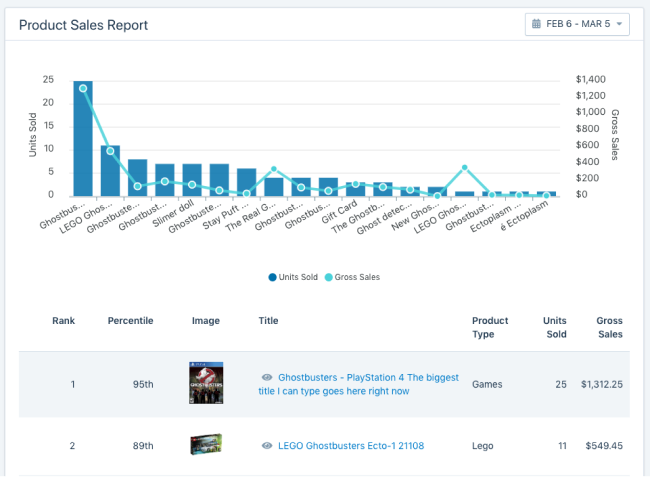 The Reports section contains the Product Sales report which can be used to drill down into your product sales. This report highlights how your products are performing including their overall sales rank and their sales percentile.