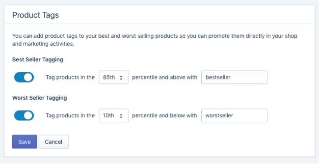 The Product Tags promotion section contains options to tag your best and worst selling products based on percentile.