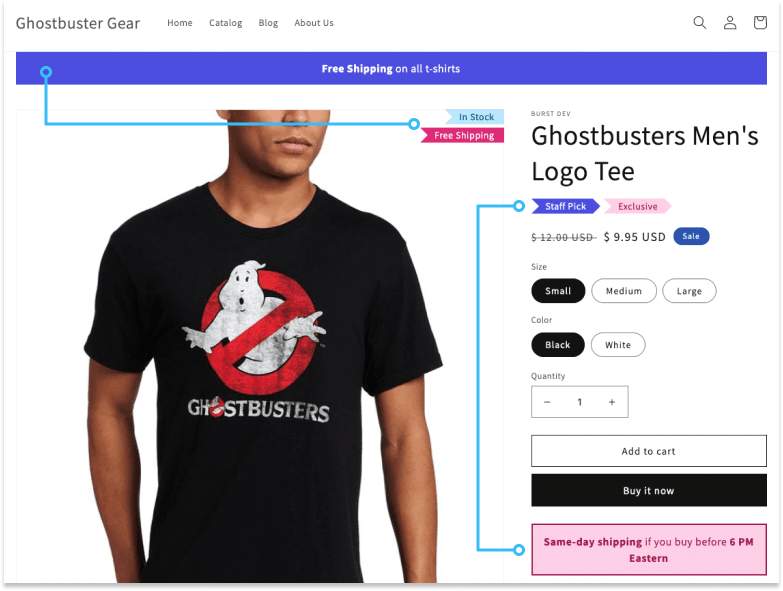Flair badges and banners can now be organized and promoted based on how you want to use them. Show your sale and promotional badges/banners in one part of your page layout, and your shipping-related badges/banners elsewhere.